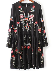 Black Flower Embroidery Keyhole Back Pleated Dress