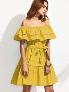 Self Tie Shirred Frill Detail Bardot Dress