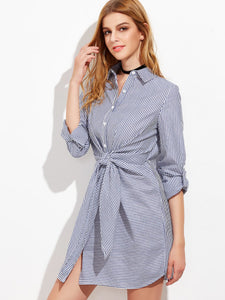Navy Striped Single Breasted Tie Waist Shirt Dress