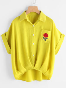 Cuffed Rose Embroidered Dip Hem Shirt w Chest Pocket